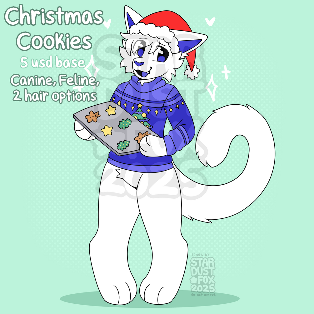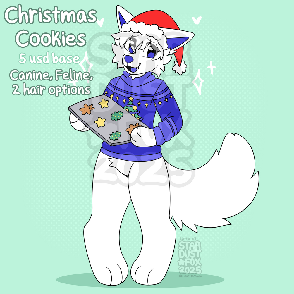 A cute base of your sona holding a tray of cookies, wearing a cute sweater and santa hat! Includes canine and feline lineart, and 2 hair options.