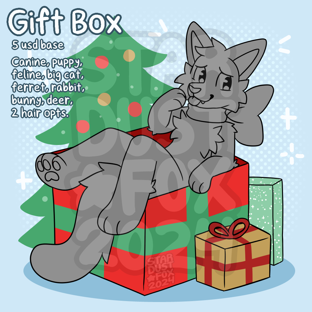 A cute base of your sona in a gift box for the holidays! Includes canine, floppy eared dog, feline, big cat, mustelid, deer, bunny/rabbit, 2 hair options and antlers.