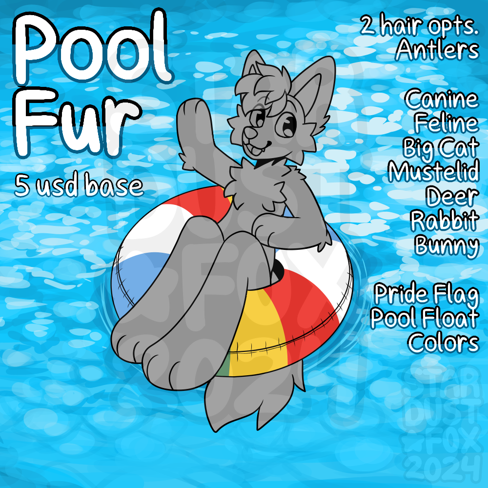 A cute base of your sona in a pool floatie! Includes canine, feline, big cat, mustelid, deer, bunny/rabbit, 2 hair options and antlers. Includes pride flag options as well.