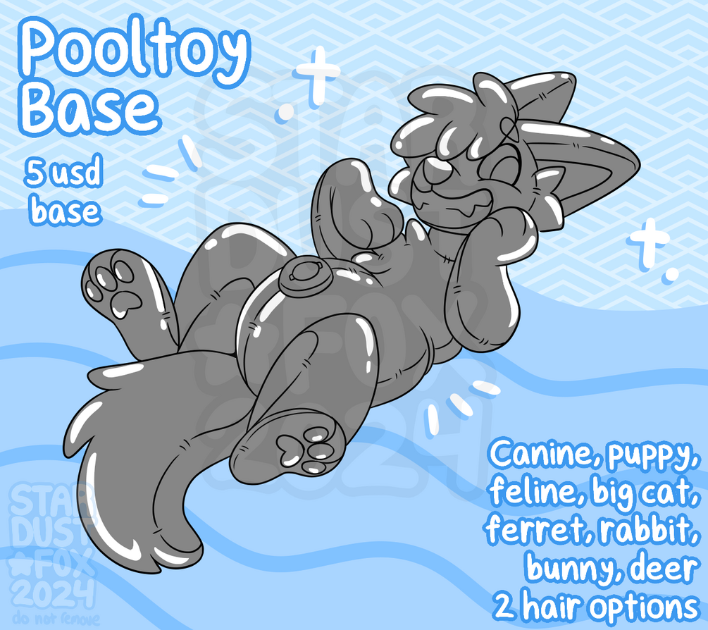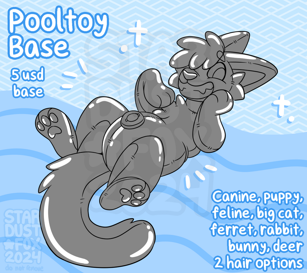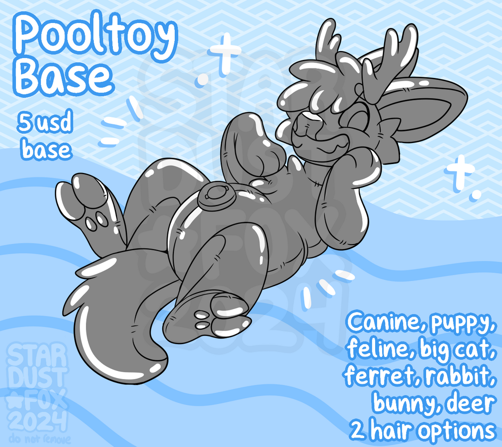 A cute base of your sona as a pooltoy! Includes canine, floppy eared dog, feline, big cat, mustelid, deer, bunny/rabbit, 2 hair options and antlers. Includes pride flag options as well.